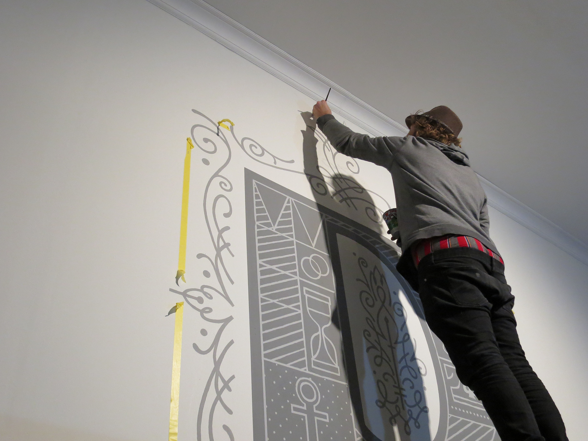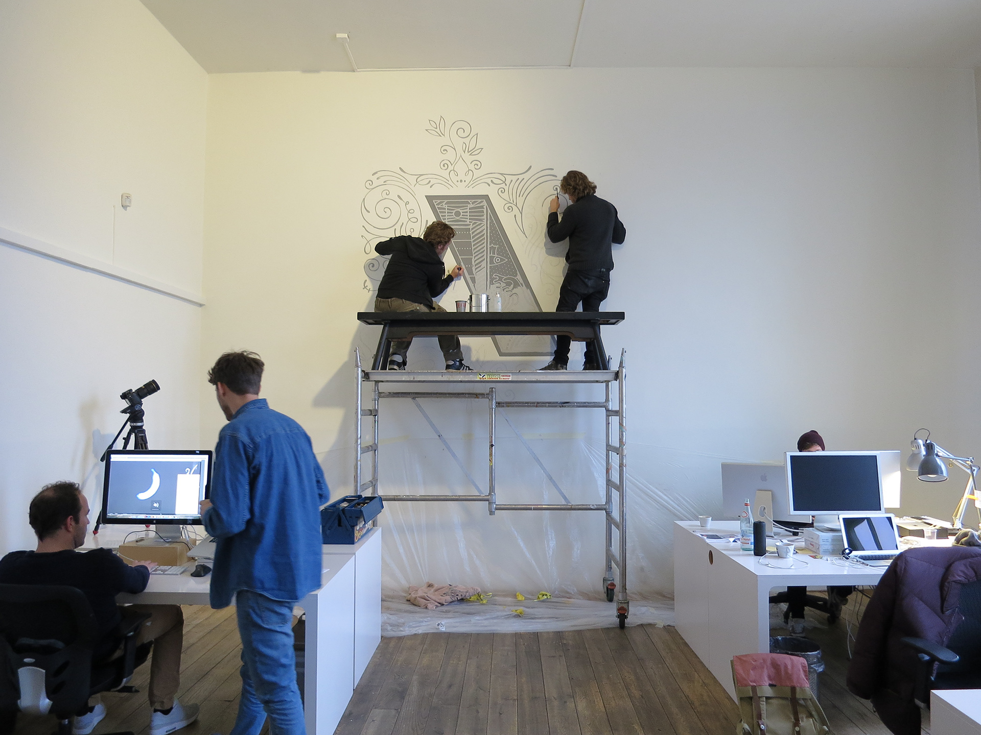 We (zender & Chaos) were invited to paint the capital letters of five different poems for advertisement agency Fitzroy in Amsterdam. Fitzroy came up with the poems that represented their philosophy and Guido de Boer did the calligraphy. Fitzroy agency's name was derived from the commander of HMS Beagle (Darwin's ship) and because of this the capital letters were filled with nautical symbols that were part of the poems. The capital letters formed one word: ADAPT, which is part of Fitzroy's mission statement: All company's should adapt to change in order to survive. The wall was finished just before their annual bash (27th of Januari 2015) as you can see in the video below.